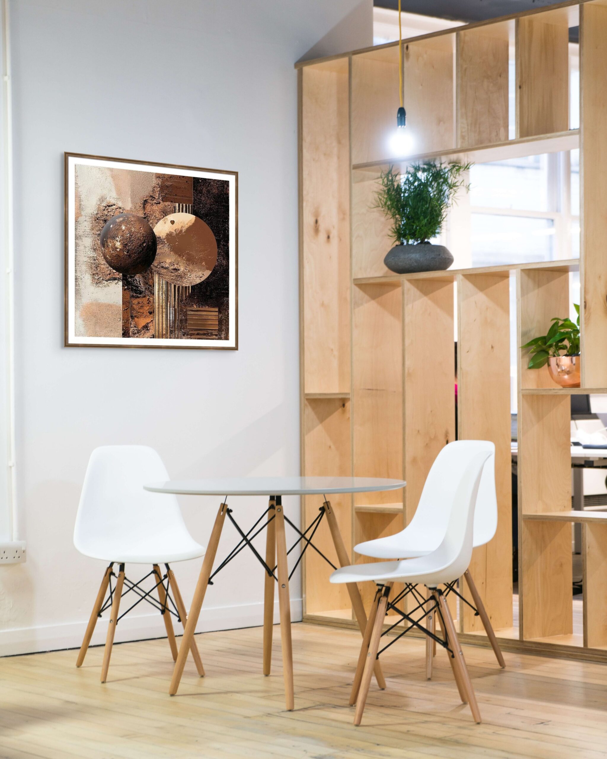 Elevate your space with vertical storage. “Mocha Muse #11 energy art by Mary Ann Benoit.