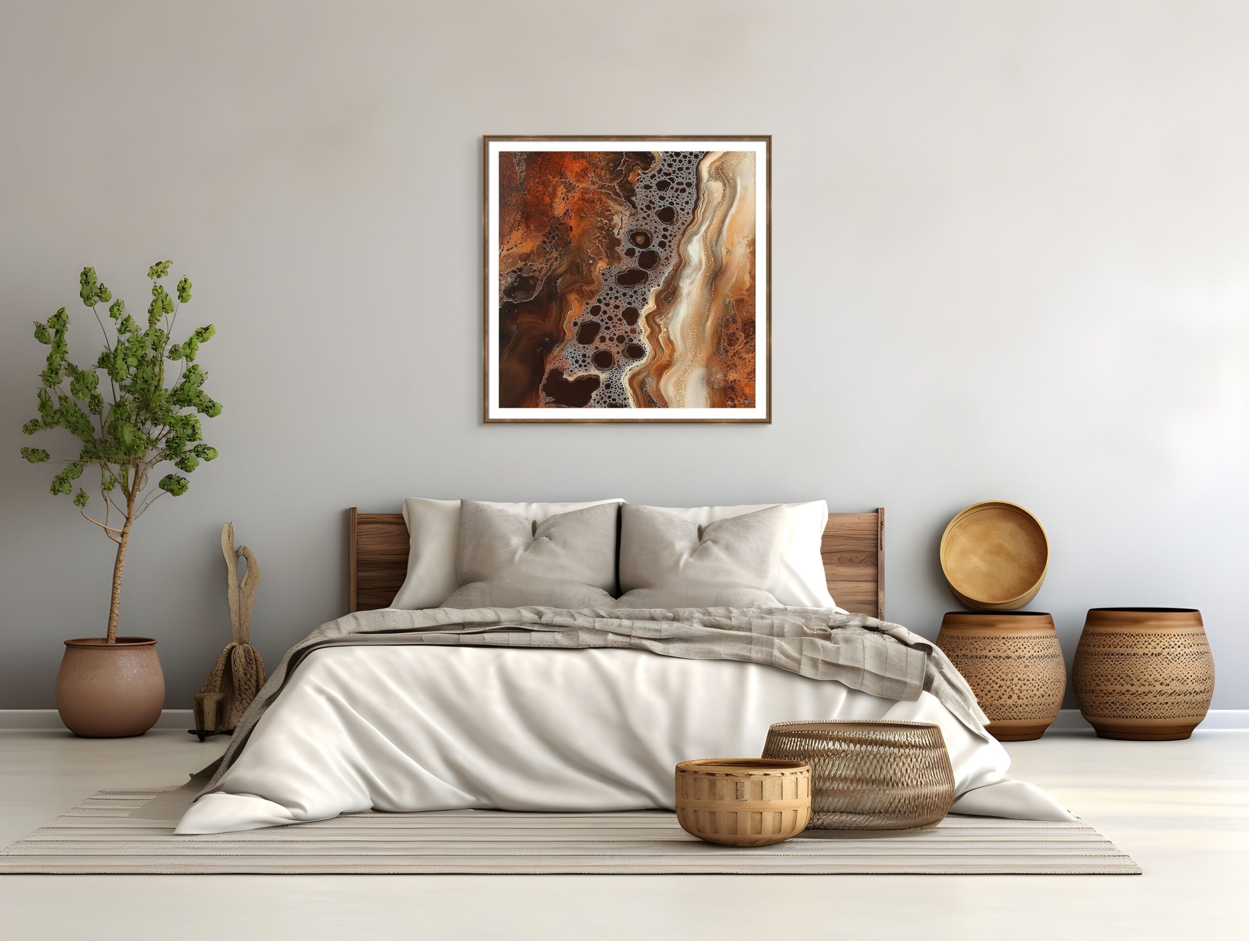 Incorporate stylish storage such as decorative baskets and boxes into your rental decor. “Mocha Muse #8” energy art by Mary Ann Benoit.